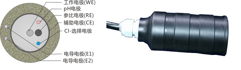 采用小幅度正弦波對埋入混凝土內(nèi)的探頭的三個電極進行激勵,同時監(jiān)測工作電極(WE)的響應電流信號。由內(nèi)置軟件可計算出電極的極化電阻Rp和電極的腐蝕速率。采用高頻率小幅正弦波對埋設(shè)于鋼筋中的兩只相對安裝的不銹鋼電極進行極化,測量兩電極間的混凝土電阻率。